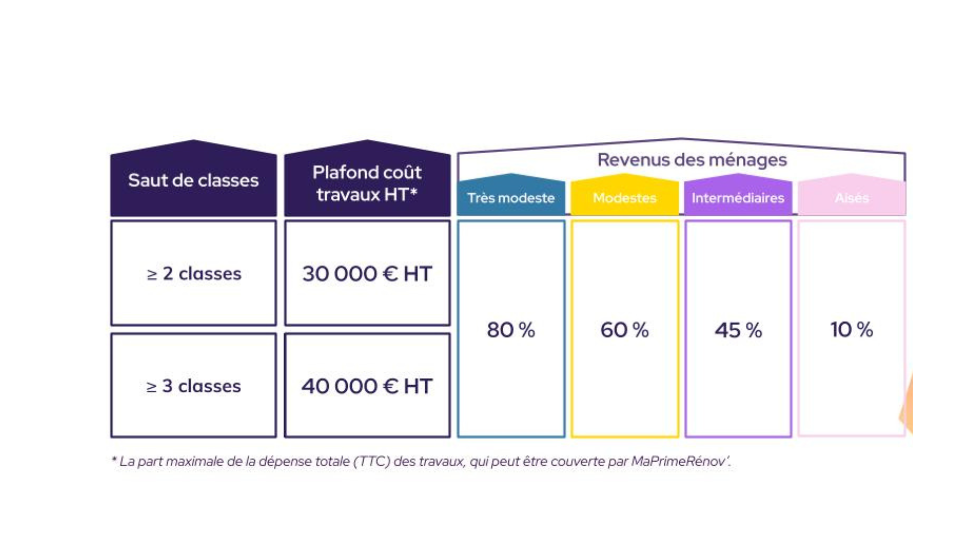 Les travaux doivent générer un gain énergétique d’au moins 2 classes au DPE (ex. passer de F à D).