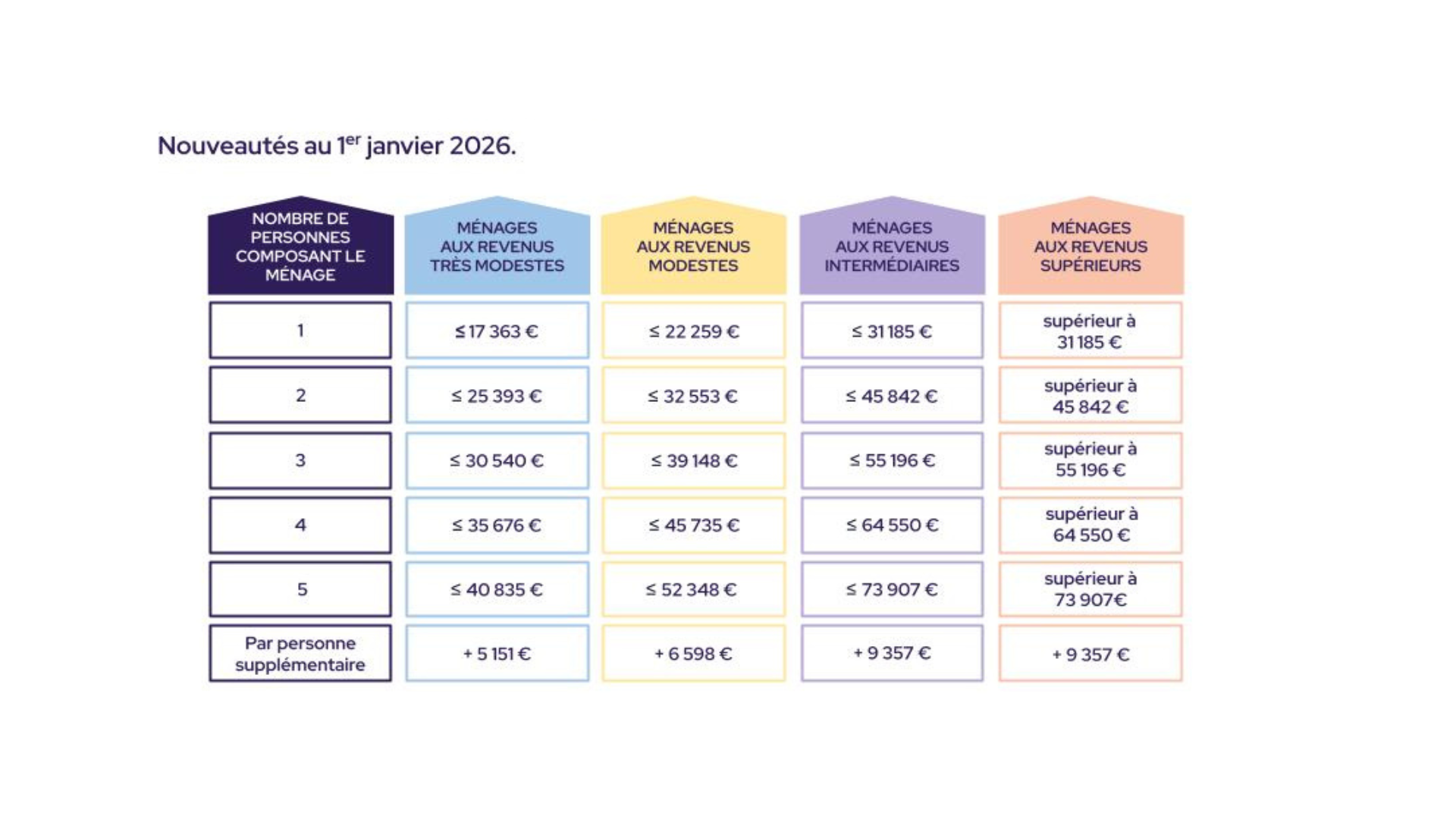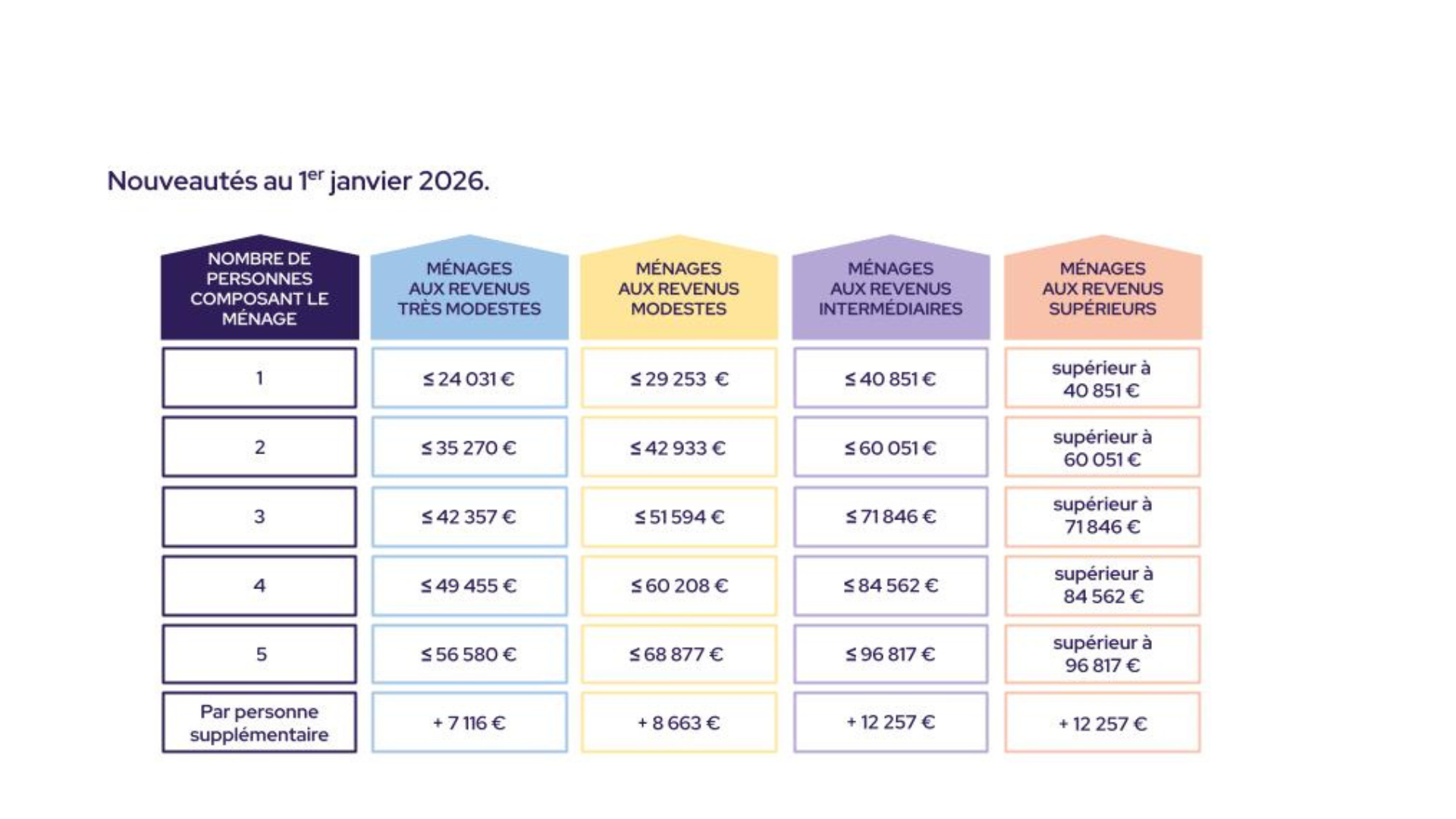 Plafonds de ressources hors Île-de-France et Outre-mer au 1er janvier 2026 :