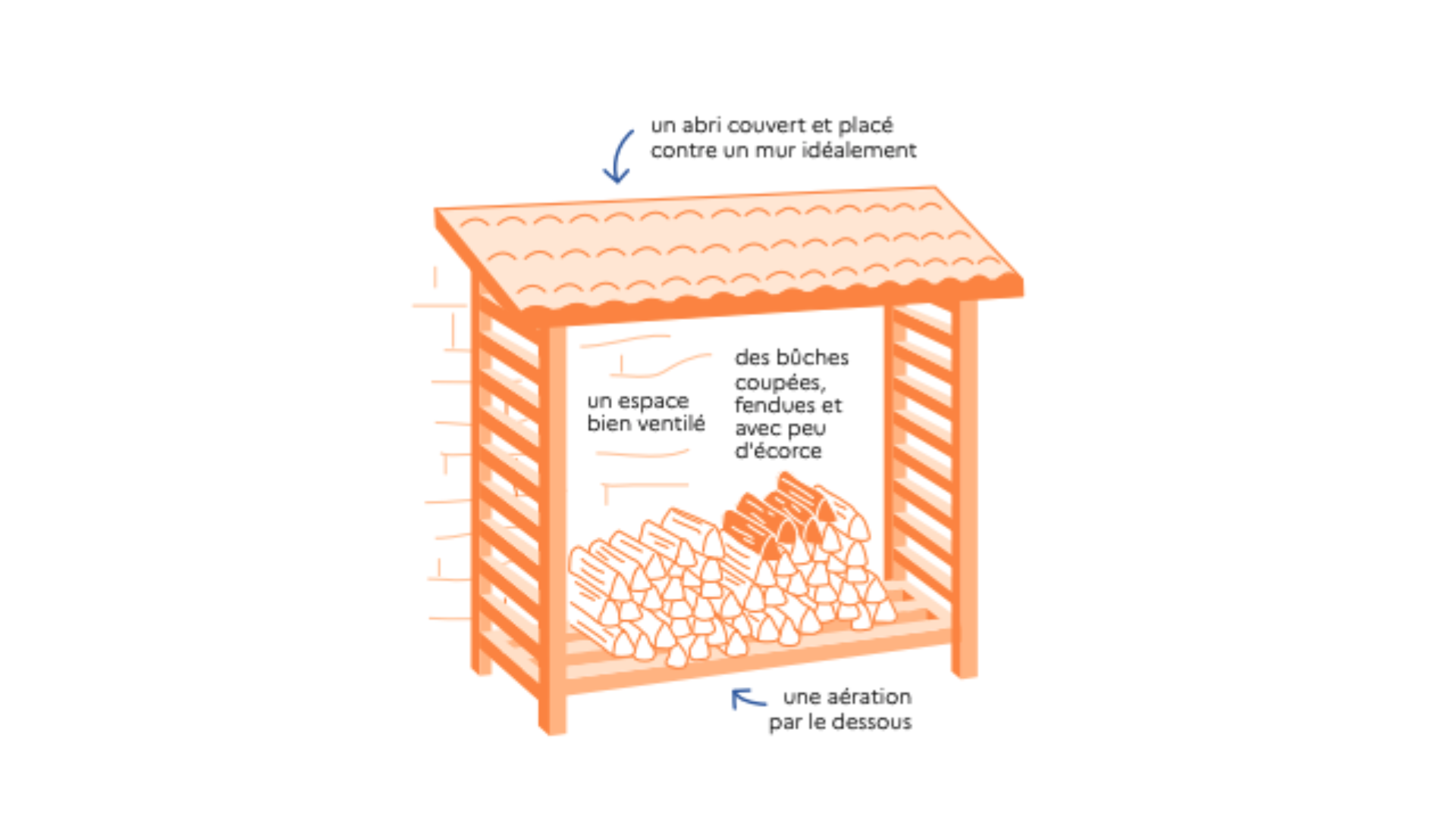 Pour une bonne qualité de chauffe, le bois doit être fendu et stocké sous abri pendant 12 à 18 mois afin d’atteindre un taux d’humidité inférieur à 20 % avant d'être utilisé. Il est préférable d’éviter les bâches étanches posées directement sur le bois, qui emprisonnent l’humidité, et de privilégier une couverture aérée.